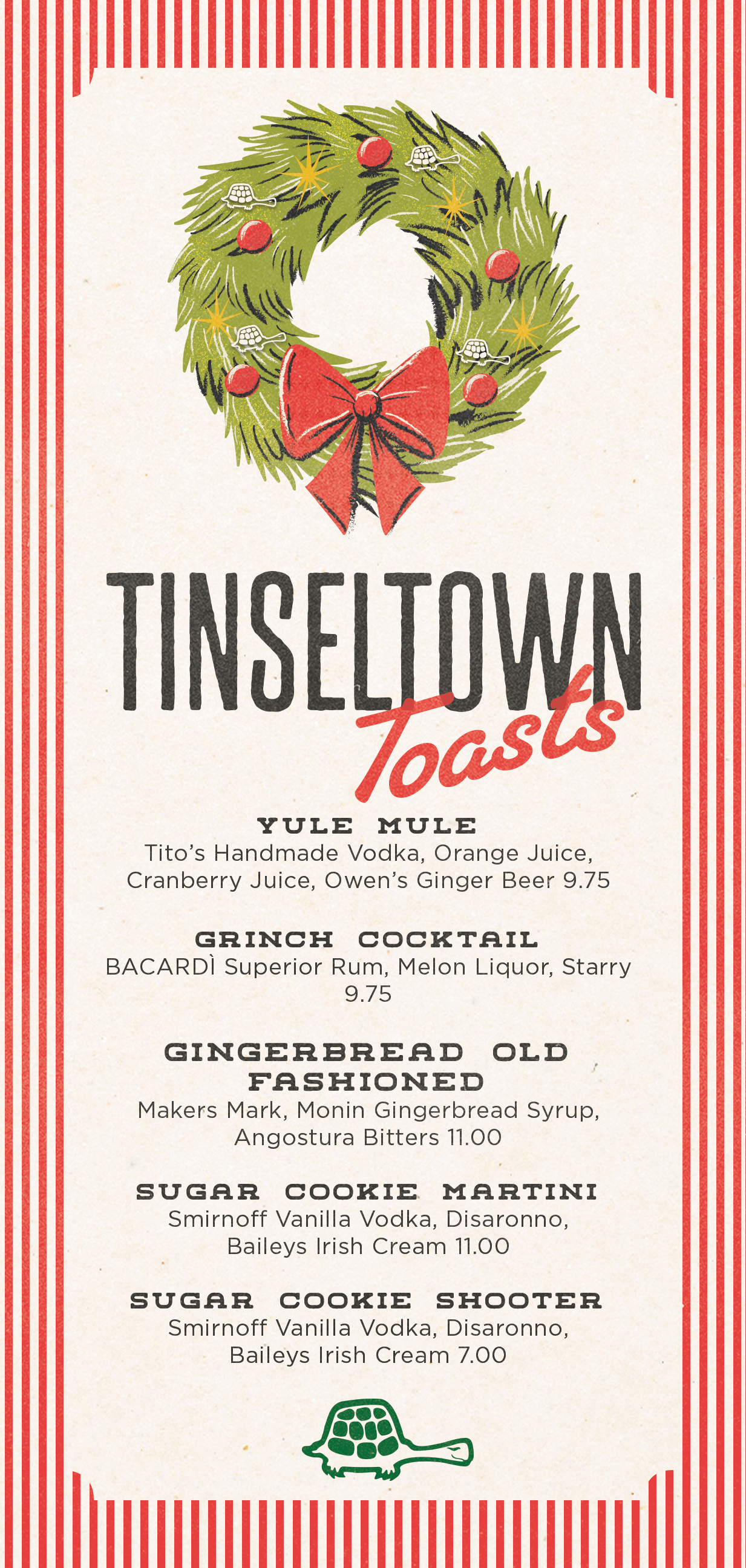 Dive into the season with our Tinseltown Toasts cocktail menu. Featuring five festive favorites, each sip is sure to spark your holiday spirit!